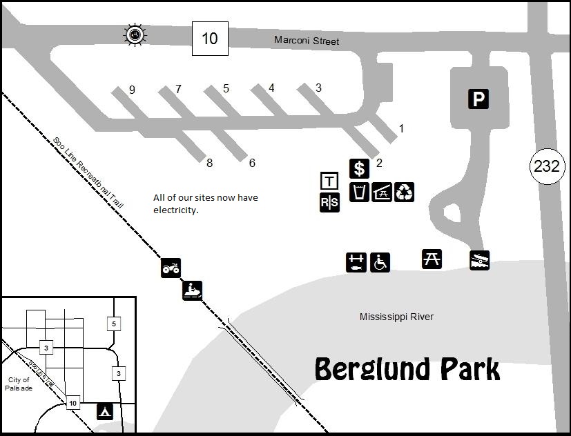 Located on the Mississippi River within walking distance of downtown Palisade. There are 9 camp sites, all with electric hookups (50/30/20 amp service), flush toilets, showers, drinking water, picnic tables, picnic shelter with fireplace, boat access to the Mississippi River, handicap accessible fishing pier, next to the Soo Line ATV / Snowmobile trail, and an RV dump station.